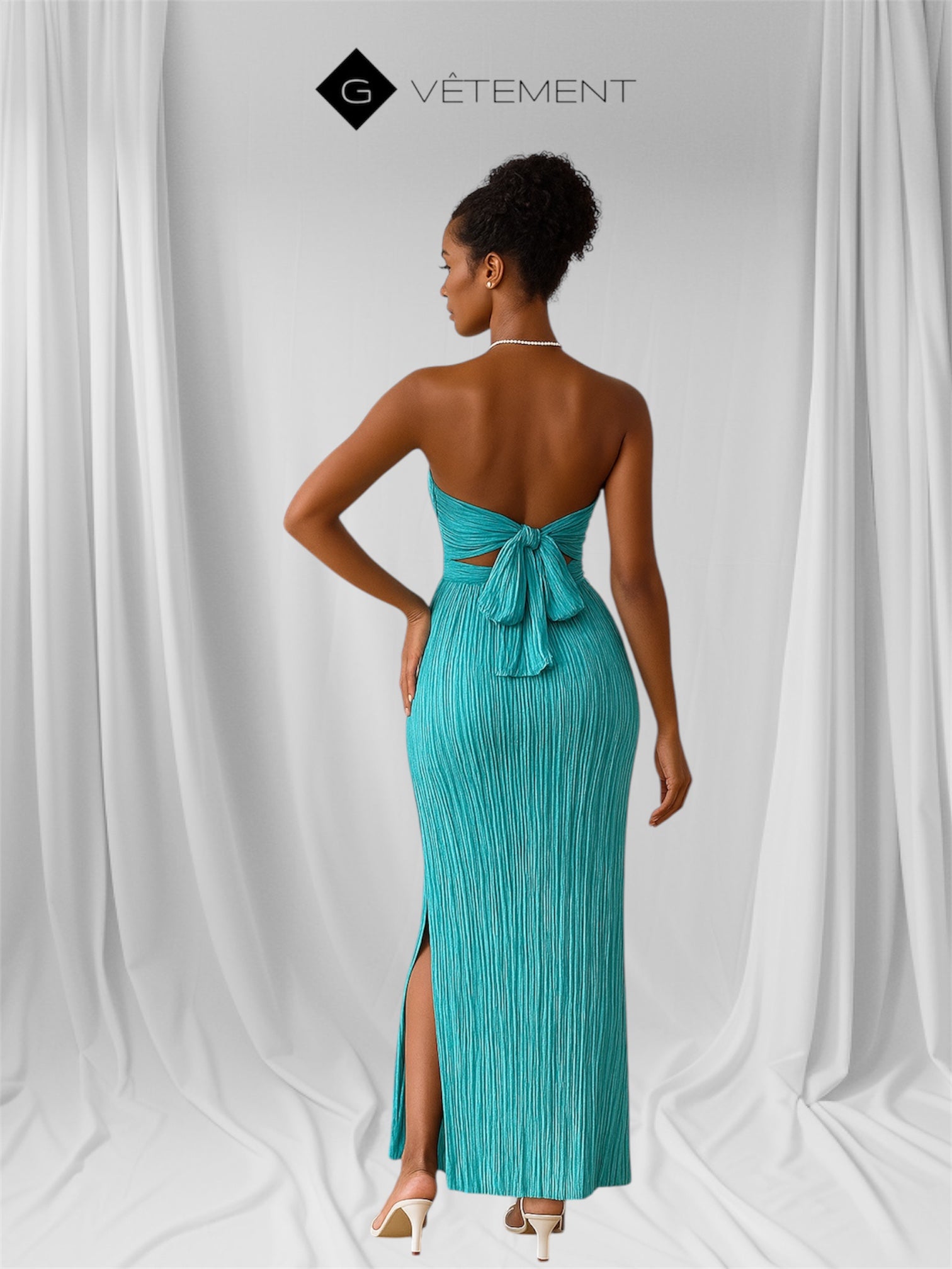 Laissez-vous séduire par l’élégance fluide et lumineuse de cette robe bustier plissée couleur émeraude. Sa coupe ajustée épouse les courbes avec grâce tandis que le tissu plissé reflète la lumière à chaque mouvement, pour un effet scintillant et raffiné. Le bustier structuré forme un joli nœud sur la poitrine, sublimant le décolleté. À l’arrière, un élégant nœud noué ajoute une touche de féminité, tandis que la fente latérale dévoile subtilement la jambe.