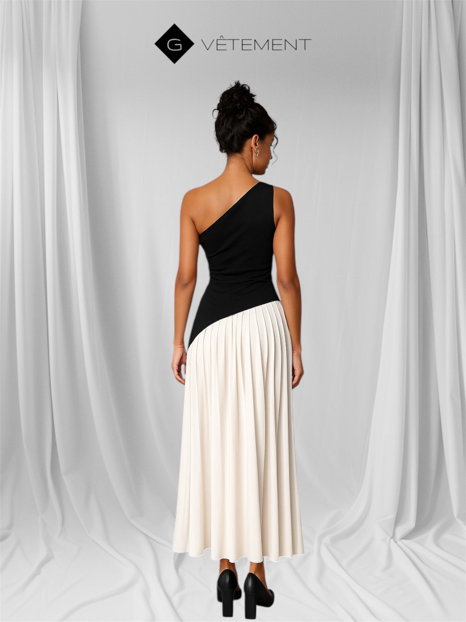 Équilibre parfait entre audace et raffinement, cette robe midi asymétrique incarne l’élégance contemporaine. Le haut noir, drapé et ajusté, dévoile une épaule avec subtilité grâce à une coupe asymétrique qui structure la silhouette. La jupe ivoire, fluide et plissée, apporte du mouvement et de la légèreté tout en contrastant harmonieusement avec le haut.